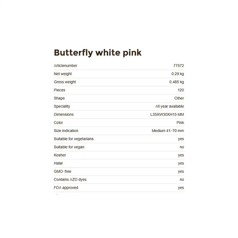 Raffinata decorazione di cioccolato a forma di farfalla bianca e rosa. Realizzata in cioccolato puro, perfetta per torte e dolci eleganti. Confezione 120 pezzi.