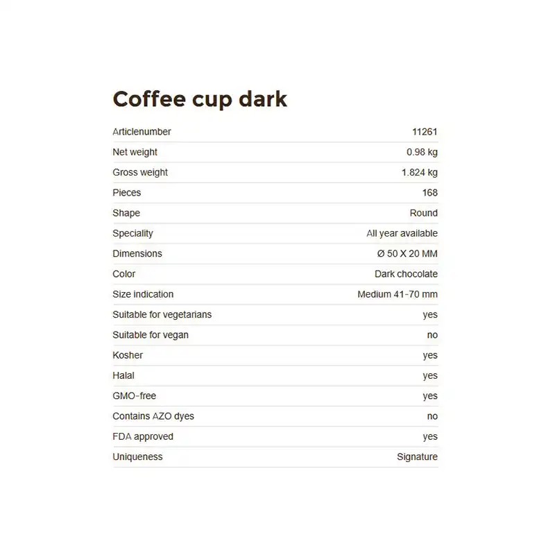 Confezione 168 pezzi. Eleganti tazzine di cioccolato fondente, ideali da farcire con mousse, ganache, creme o dessert al cucchiaio. Perfette per eventi, catering e pasticceria creativa.
