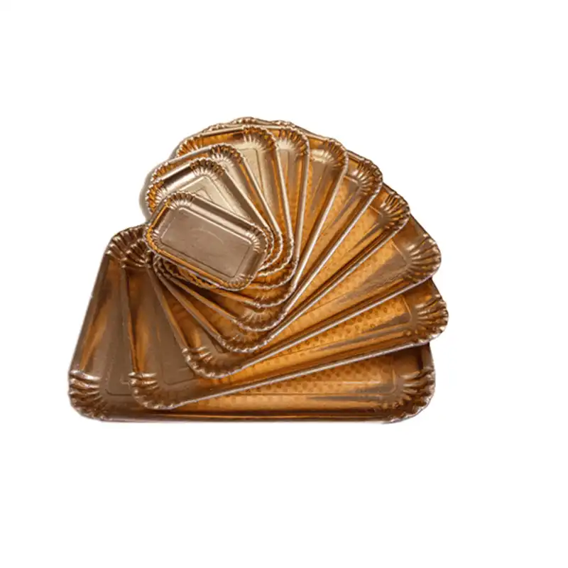 Ogni vassoio è realizzato in carta rigida e resistente, con finitura oro lucido per una presentazione elegante e professionale. Sono leggeri, igienici, monouso e facili da impilare. Si prestano perfettamente per esposizione in vetrina, trasporto di prodotti da forno, catering, eventi e vendita da asporto. Il colore oro dona un aspetto raffinato, valorizzando torte, semifreddi, crostate, biscotti e monoporzioni.