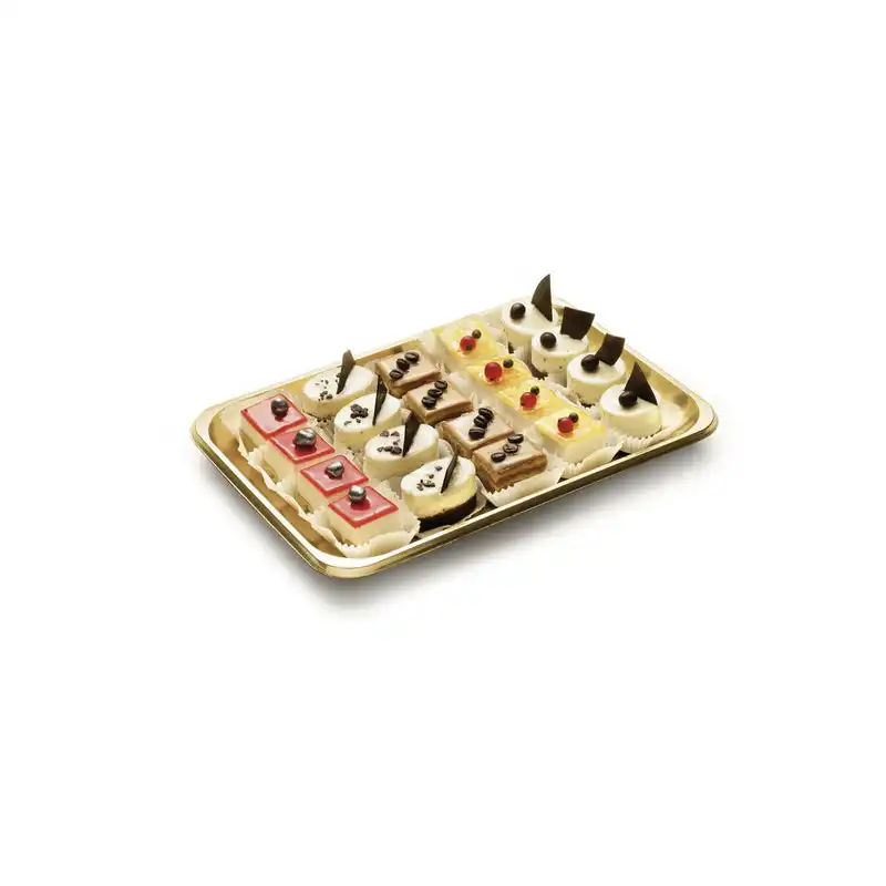 Vassoio oro rettangolare per dolci in confezione da 10 pezzi, disponibile in 8 misure. Elegante, resistente, perfetto per ogni creazione dolciaria.